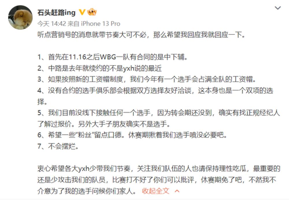 而且石头老板透露,按照最新LPL工资帽的制度,WBG今年确实会有一个选手会占满全队的工资帽。不过在文中石头老板也表示今年队伍不会摆烂,相信他们也会在转会期尽力操作为队伍进行阵容的升级补强。