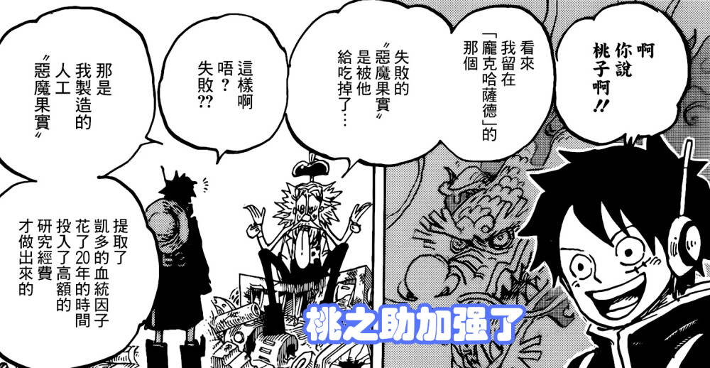 恶魔果实是不是900年前巨大王国研究出来的产物呢?还是自然生成的神奇果实?贝加庞克利用血统因子+恶魔果实的血统因子成功制造出【人造恶魔果实】,其中桃之助吃下的【幻兽种蛟龙形态】并非失败品,而是货真价实的成果品。