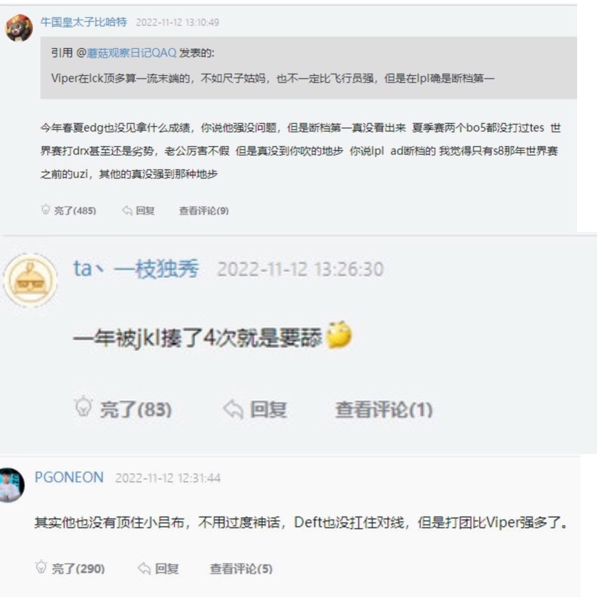 网友们对此似乎并不认同,网友认为:今年春夏edg也没见拿什么成绩,你说他强没问题,但是断档第一真没看出来、夏季赛两个b05都没打过tes ,世界赛打drx甚至还是劣勢,说断档只有s8之前的Uzi;一年被jkl揍了4次就是要夸;其实他也没有顶住小吕布,不用过度神话,Deft也没扛住对线,但是打团比Viper强多了。