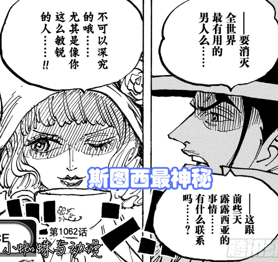 但是这样也代表了斯图西并没有想象中那么简单,在1062话她与路奇的对话来看,知晓了不少路奇等人不知道的信息,还让路奇别想太多,因为这样很容易出事。