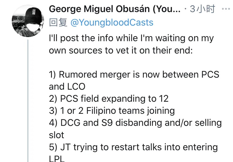 值得一提的是,早在11月8号就有菲律宾记者爆料下赛季PCS 赛区和将要LCO(大洋洲)赛区合并,回头来看爆料还是挺准的。其中有一条爆料不知道会不会成真,那就是JTEAM试图重启进入LPL的谈判。JTeam的前身是S2总冠军TPA(暗杀星),tpa于2016年被周杰伦旗下的公司收购了,目前国内的手游联赛就有jteam。游戏酱park网上冲浪看到有网友锐评若jT加入LPL,那LPL能继承S2冠军不?我的观点是继承不了。你像ogn是lck的前身,lck继承ogn的荣誉顺理成章。但是说lpl继承lms的荣誉完全是没有脑子的说法,不同的两个赛区,而且s2可没有lpl,非得把s2的荣誉继承到lpl上,想法真是逆天。