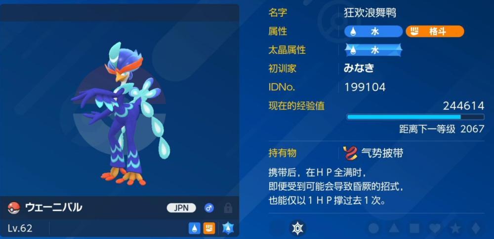 它的种族值中HP85/防御80/特防75,虽然没有明显的短板,但弱点属性较多,包括飞行、草、电、超能力、妖精。但是别担心,我们可以通过太晶化变成单一水属性来规避掉飞行、超能力、妖精这三个弱点,提高幸存能力的同时,还能进一步增加【流水旋舞】的威力。