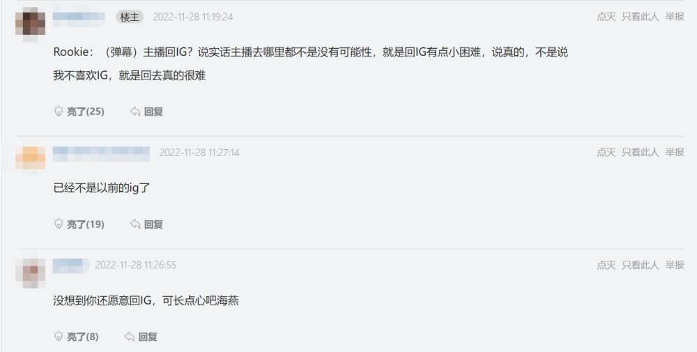 编辑搜图请点击输入图片描述(最多18字)面对粉丝以及观众在直播间通过弹幕的询问,Rookie也是谈到了自己的去向,直播时肉鸡坦言道:“说实话主播去哪里都有可能性,就是回iG有点小困难。”这样的回答让直播间不少老iG的粉丝感到失望,不过Rookie也表示回不去iG的原因不是因为“不喜欢”,因此有网友猜测可能是待遇或者阵容的吸引力不够,或者更直接的原因可能是iG已经没钱签下Rookie了。