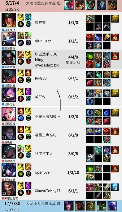 第三个消息是LPL首个FMVP冠军打野Ning复出!网友们找到Ning去UP试训的比赛结果,虽然UP被EDG二队碾压,但Ning使用凯隐打出4/4/0的成绩,奈何队友不给力。