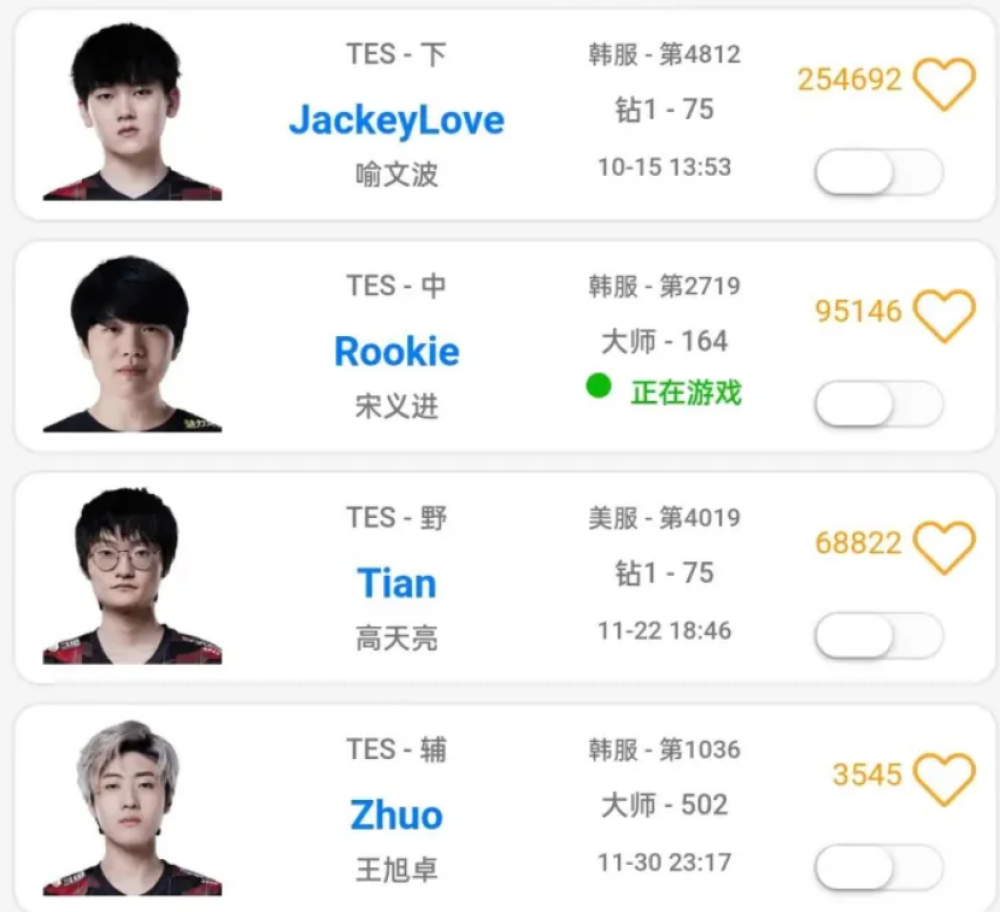 翻看TES在LOL韩服的Rank主页,前FPX打野、中单爆料或成真!义进哥Rookie出现在了TES队员列表中,目前正在通过高分段排位赛热手,全力备战2022LPL全明星盛典,值得粉丝期待。