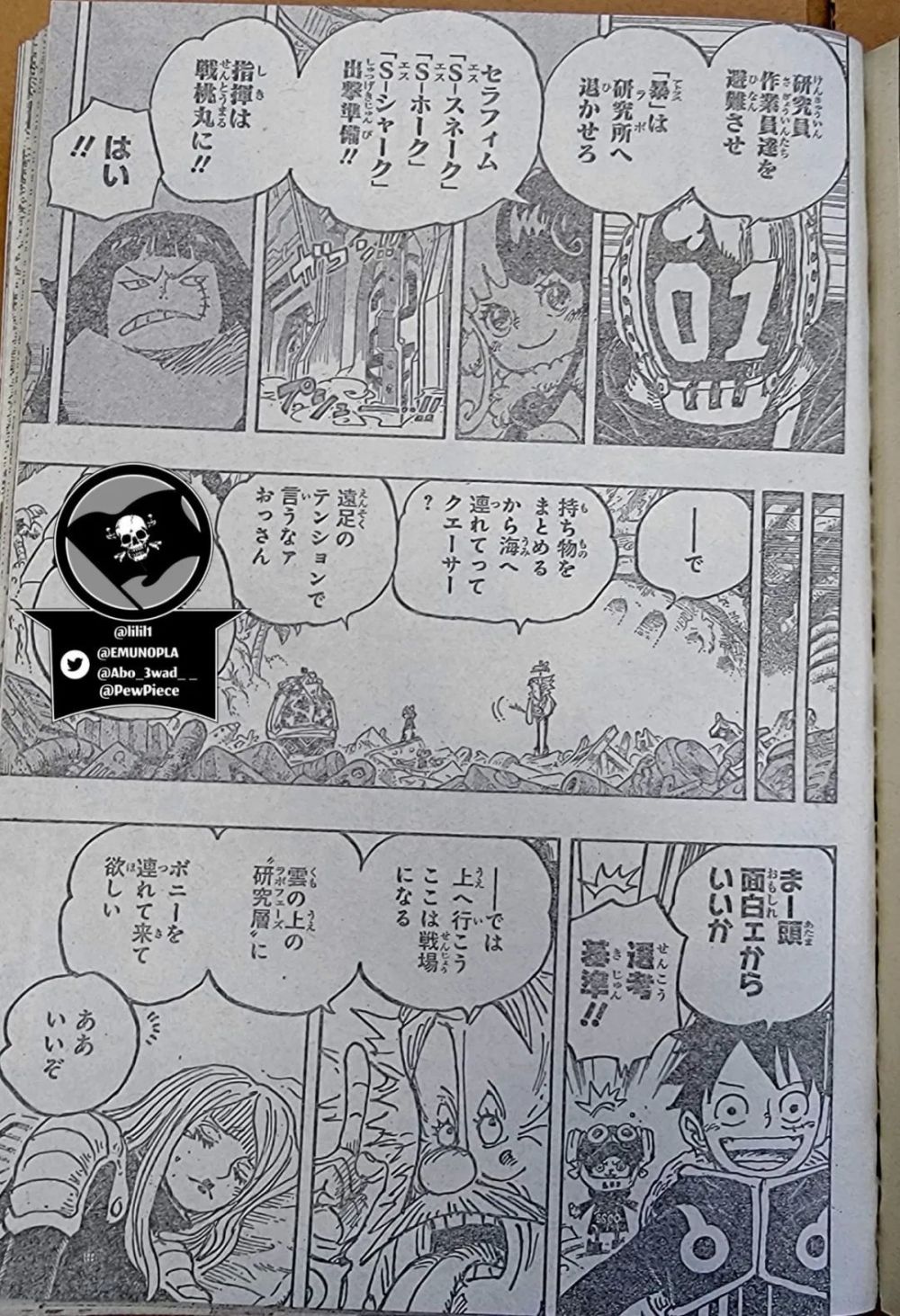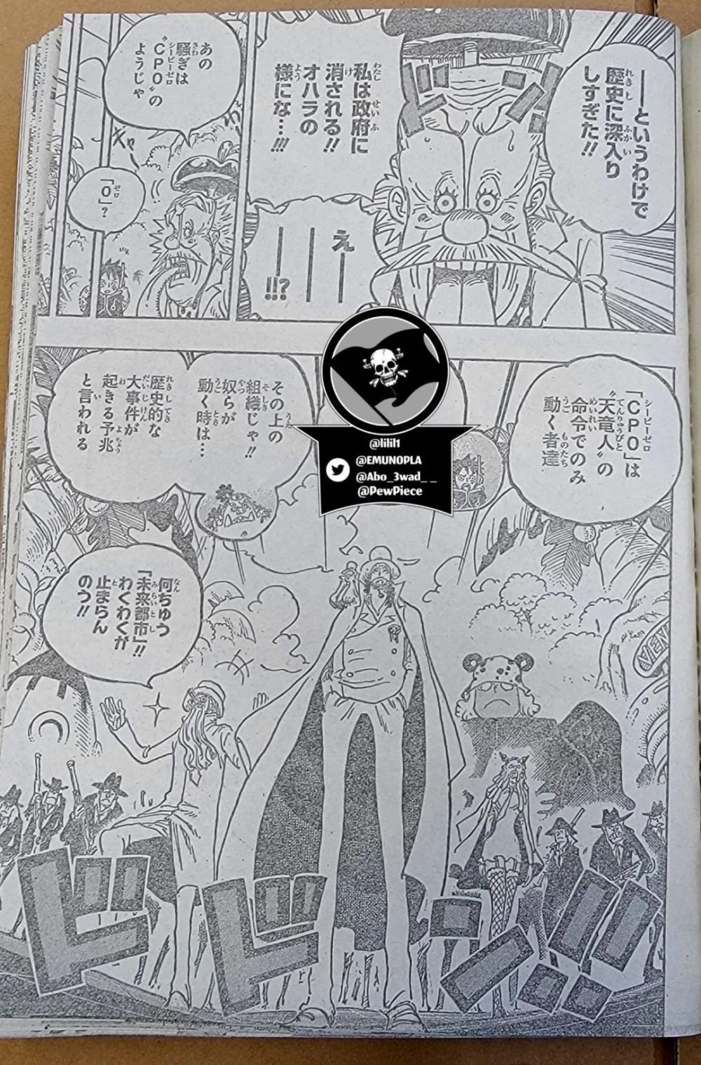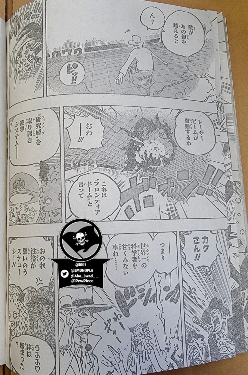 画面切换到路飞这边,贝加庞克说他研究空白的100年太过于深入了,因此他即将被世界政府抹杀,就像当初的奥哈拉一样。