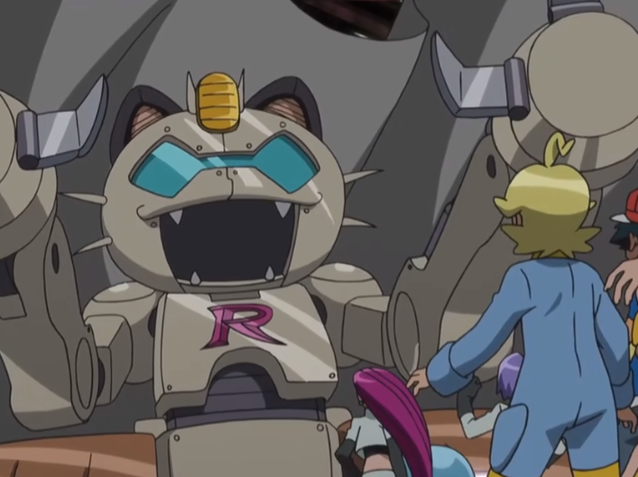 火箭队三人组想要从布拉塔诺博士的手中得到超级进化的相关信息,并且用爪子刮板弄出很难听的声音导致布拉塔诺博士就范(嗯,,虽然这种声音真的很折磨人,但真就一点毅力都没有呗),得到了布拉塔诺博士手中的储存卡之后,火箭队三人组开始研究超级进化的相关信息,并且打算靠着这一手信息改造出符合超级进化的机器人,也就是超级喵喵——由喵喵亲自上手操作,于是,就在小智和希特隆赶到的时候,超级喵喵正好登场,成为了阻碍。