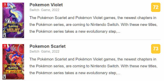《宝可梦紫》的MC均分72为历代宝可梦正作中的倒数第一,而《宝可梦:朱》的MC均分为73分,与《宝可梦晶灿钻石/明亮珍珠》一起名列倒数第二。