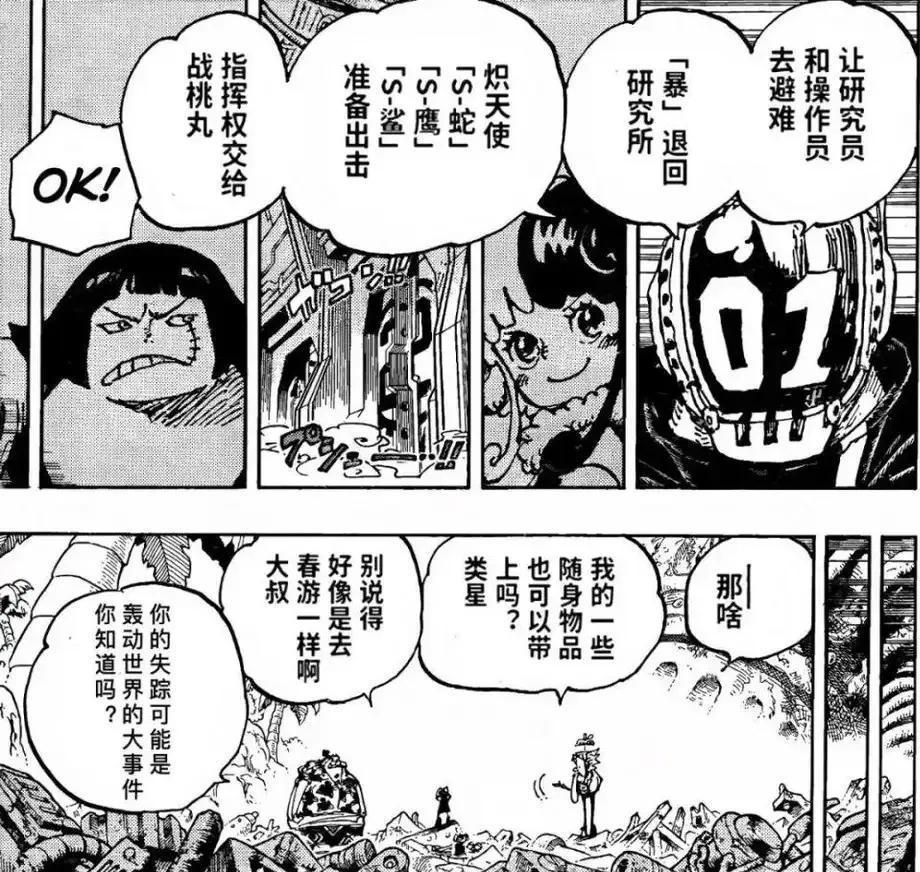 海军本部已经得到CP0进入艾格赫德刺杀贝加庞克的事情,战桃丸第一时间通知了黄猿。附近的海军基地应该有所行动了,毕竟他们驻扎在这里,就是为了保护贝加庞克。黄猿得知草帽一伙,CP0都在未来岛,他也想前往未来岛,只是赤犬阻拦黄猿出动。路奇等人的行动必定是受到五老星的授权,海军大将前往未来岛肯定会被五老星责罚。