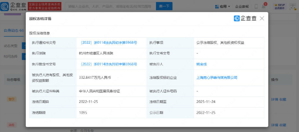 法院具体的判决如下图所示,表示将冻结姚金成股权和其他投资权益数额332万余元,而被冻结股权的企业是上海竞心承峰传媒有限公司,被执行人就是RNG的老板姚金成,也就是大家熟悉的白星。冻结的时间是1095天,差不多是3年。