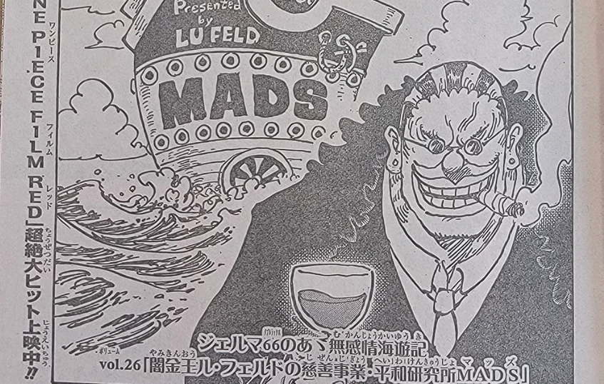 本话扉页基尔马无感情的海游记系列,事关一座和平研究所mads,没啥看头!紧接上话,路飞扛着波妮看见路奇,于是停了下来,